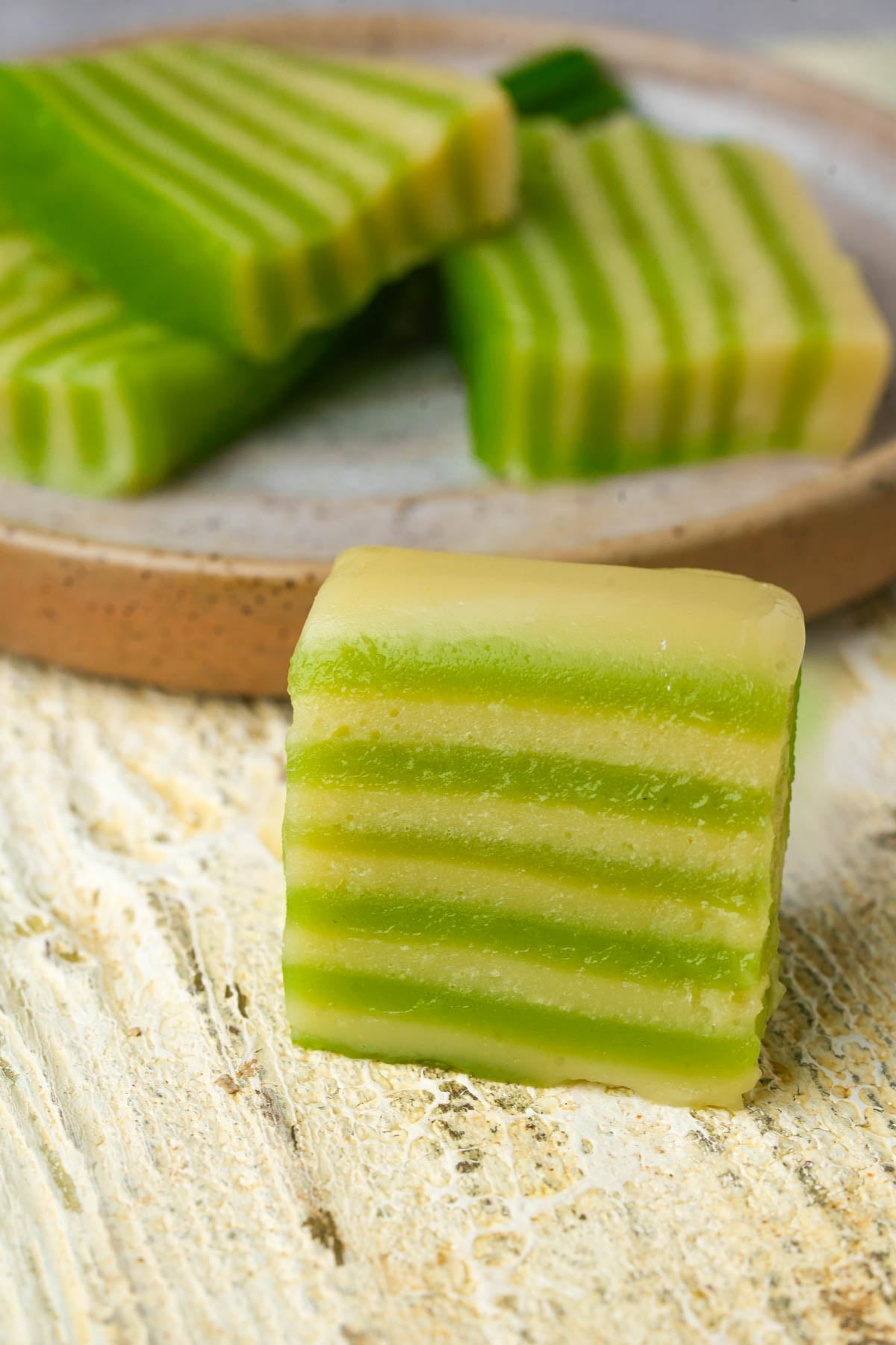 - Stir Before Every Single Pour: Tapioca starch settles fast and does not care about your feelings. Give the green batter and the yellow batter a gentle stir right before pouring every layer or you'll end up with some layers having a thiner or thicker consistency than others.