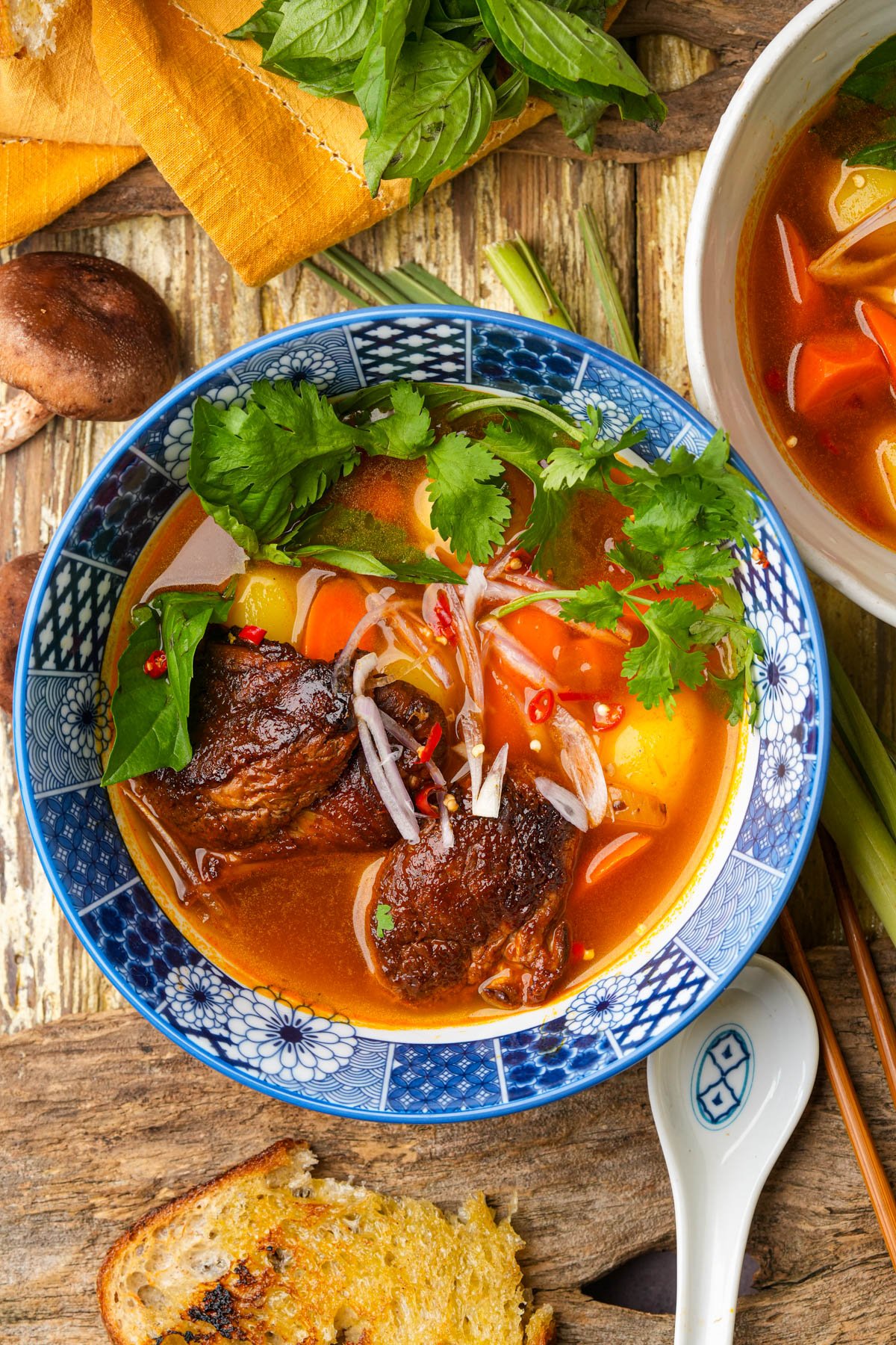You've got tender slow-simmered beef chuck and large carrots swimming in a brick-red broth loaded with lemongrass, star anise, cinnamon, ginger, annatto seeds, green onion, and all the aromatics that make your kitchen smell ridiculously good. It's traditionally served with crusty bánh mì for dunking, or spooned over rice or your favorite noodles. That deep red color comes from annatto oil, and five spice is doing most of the flavor work so you don't have to stand there measuring out a million tiny jars.