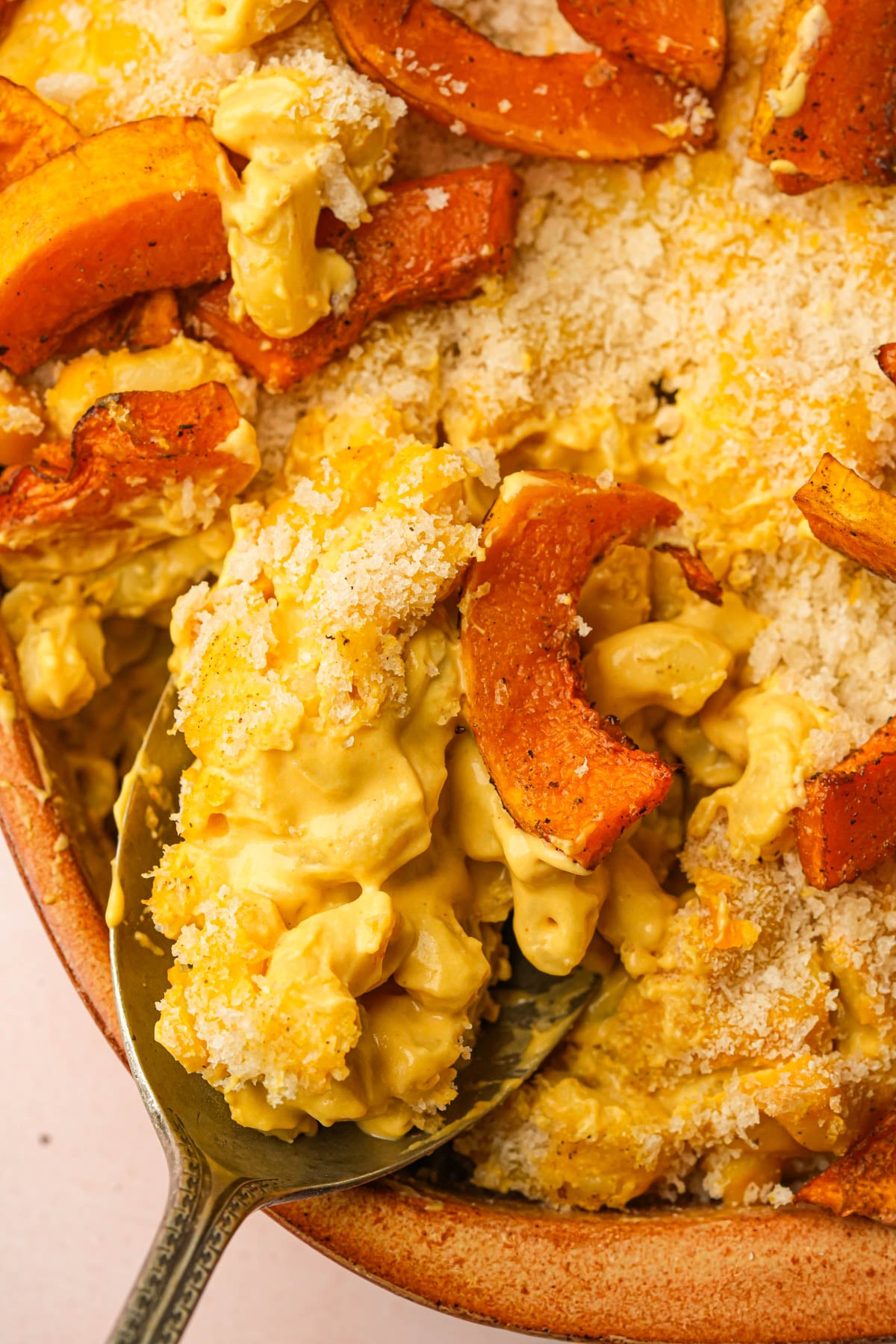 - Spread the mac 'n cheese into a casserole dish. Top with the roasted squash and breadcrumbs. Bake until the breadcrumbs are golden and crisp, 12-14 minutes.