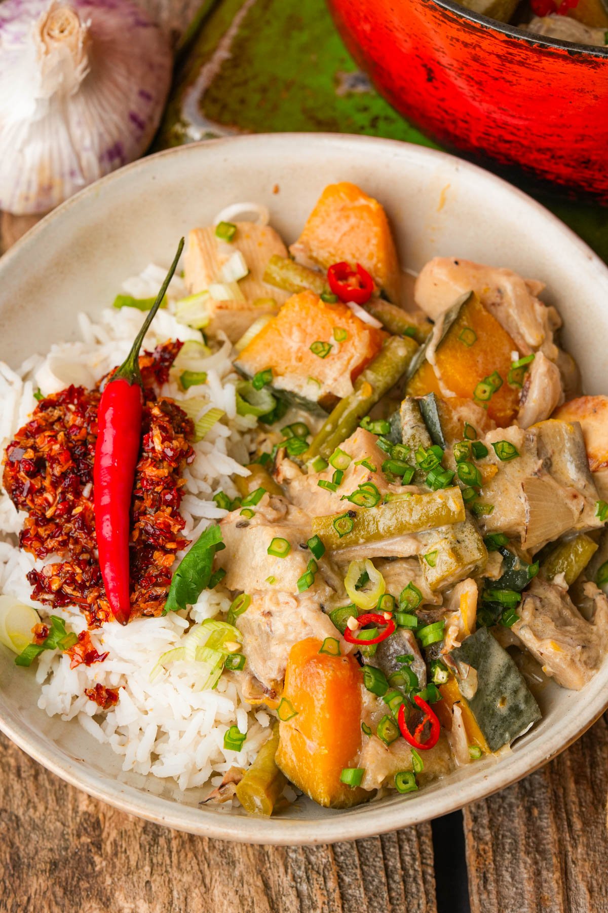 For a full send, pile this on some fluffy white rice, Thai coconut jasmine rice, or nasi uduk. Then, serve some vegan lumpiang shanghai on the side for a crispy, sizzling counterpoint to all that coconut creaminess.