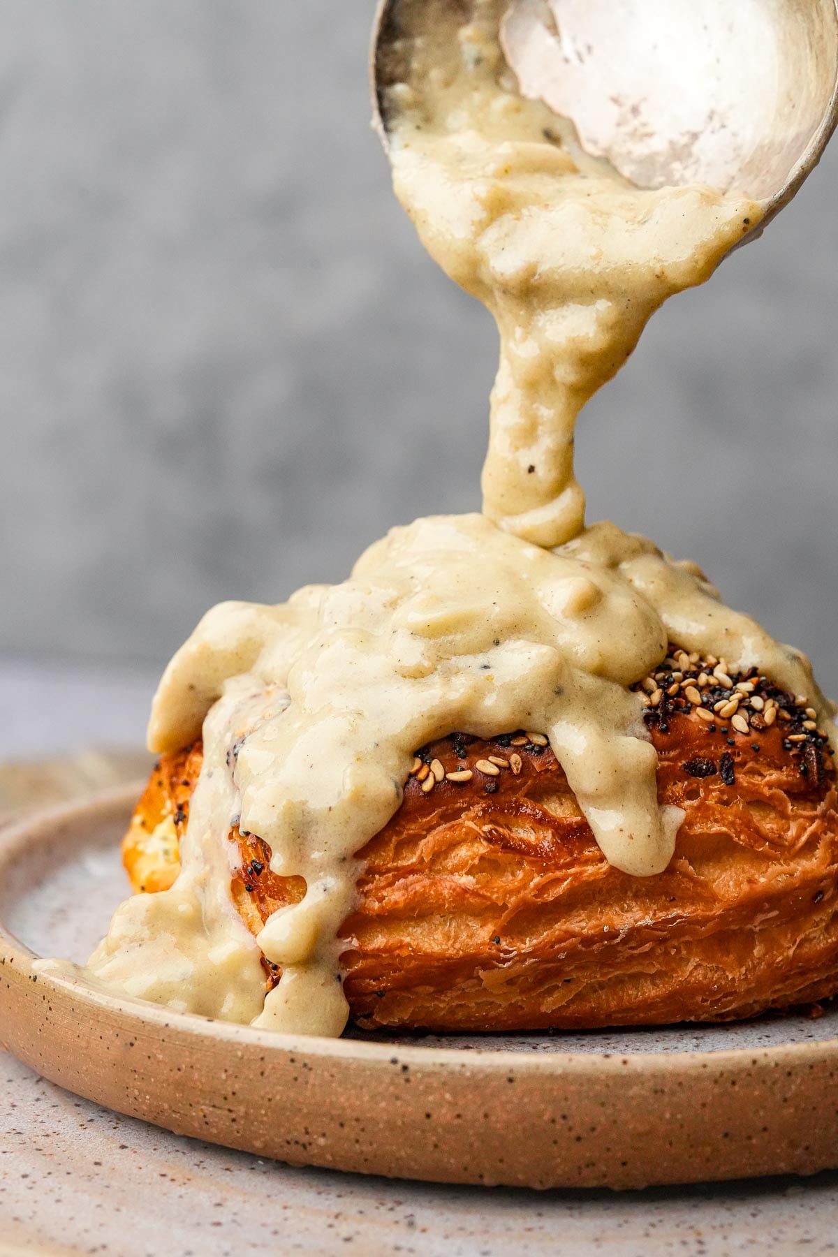 Pour this glorious white gravy all-the-heck-over a bed of creamy grits for a Southern-style brunch that slaps. It's also stupid-yummy on hash browns or crispy Indonesian vegetable fritters.