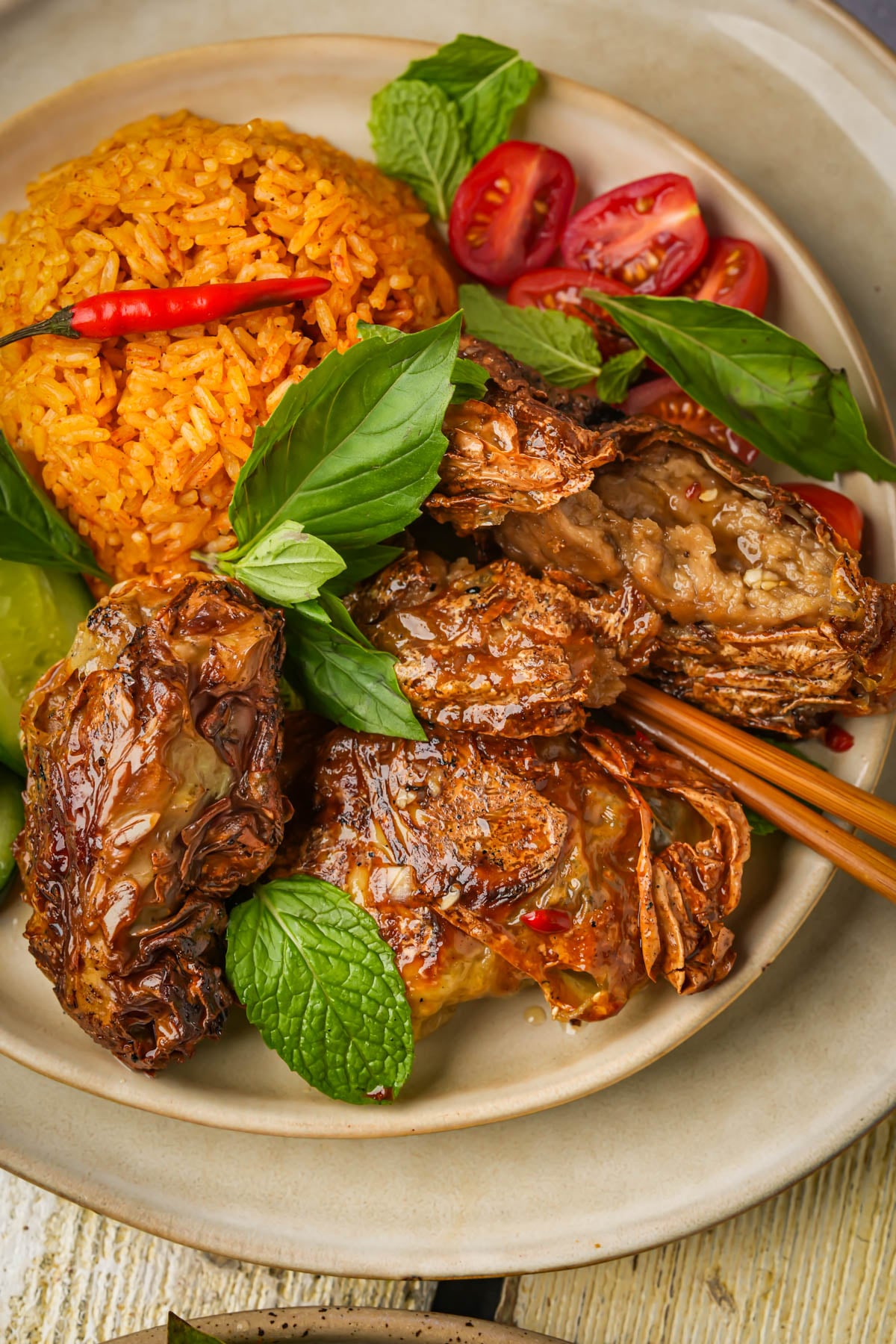 Serve the sauce-coated chicken with the tomato rice, cucumber slices (or full on Vietnamese cucumber salad instead), cut cherry tomatoes, fresh herbs, and sliced chilies.
