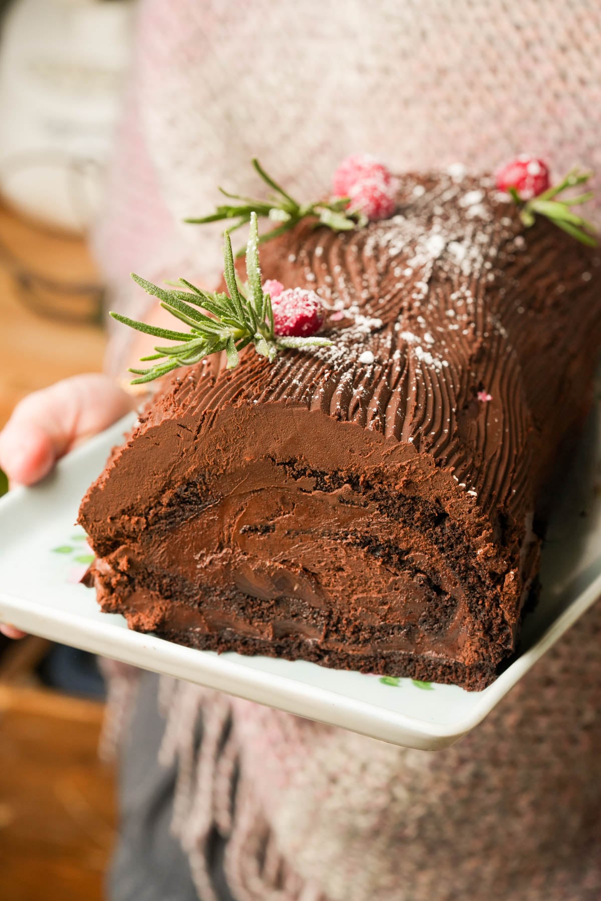 Keep the yule log on a large plate or cake stand and if you don't have a cake box or cake carrier on hand, cover it with a glass dome or an overturned bowl to prevent it from drying out. Refrigerate for up to 4 days. When you're ready to serve, let it sit at room temperature for 15-20 minutes so the ganache softens to that perfect, sliceable texture.